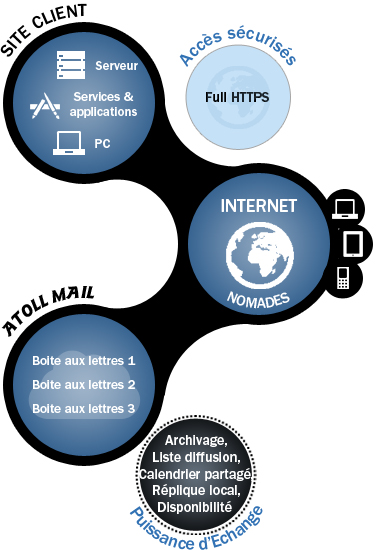 ATOLL MAIL est disponible en mode dédié ou en mode mutualisé et s'adapte de la plus petite structure (5 BAL) jusqu'aux très grosses (3000 BAL ou plus).